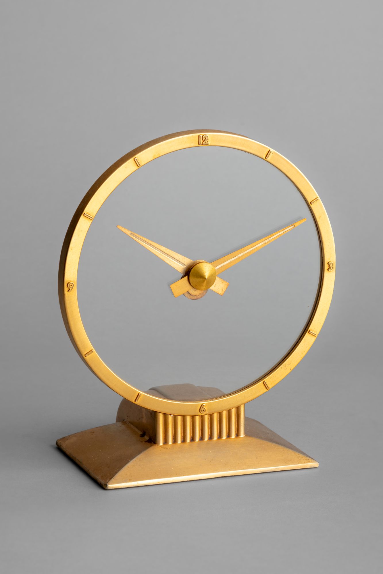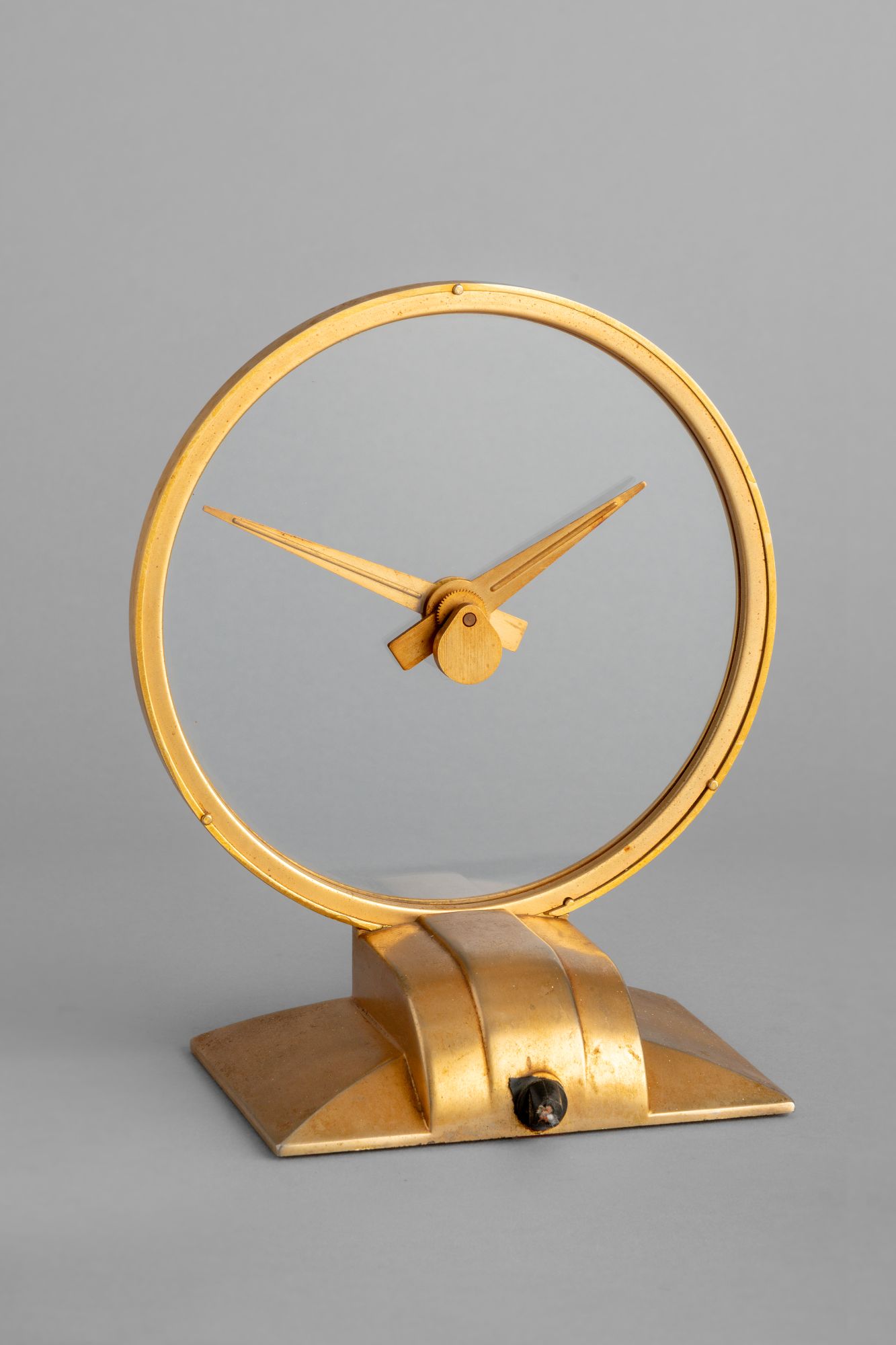 The principle is extremely simple, and yet effective: the minute hand is moved by the regular, but invisible, rotation of the glass, while the hour hand is driven by a weighted mechanism behind it. The clock runs on a synchronous motor in the base, geared down to 1/6 rpm with a cut brass gear on the output shaft. The dial is circular glass cemented into a large peripheral sheet-metal ring with gear teeth that mesh into the motor drive gear, turning the dial at one revolution per hour. Both the ring and base are made of a zinc alloy, plated with 24k gold. In common with most Golden Hour clocks produced before the mid-1960s, this clock has radium paint on the numerals and markers of the ring and lines on the hands.