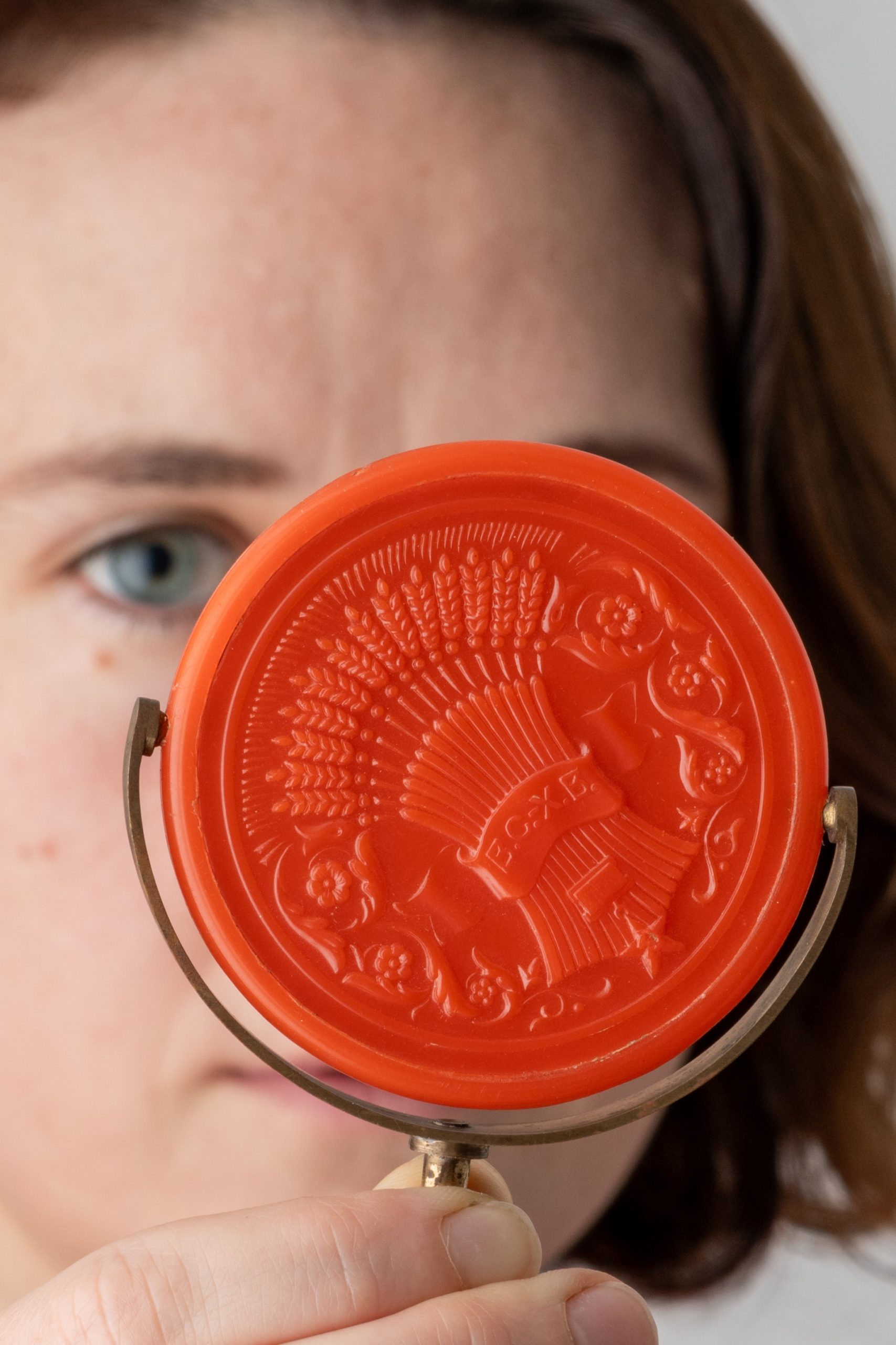 This clock was retired from use in 1997 and purchased from Kirill Romanov in 2002. Its subsidiary dial has standard, rather than regulator presentation, and may not be original to the clock. Another later addition is the small adjustable mirror, intended to help illuminate the pendulum scale; this is not the original scientific instrument, but an orange plastic-backed compact mirror decorated on the reverse with a moulded wheatsheaf emblem and the motto ‘VDNH’ (ВДНХ). This was the acronym used by the Exhibition of Achievements of National Economy, a trade show and amusement park that opened in Moscow in 1939, and exemplified the Soviet passion for technology, much like the ACHF3 itself.