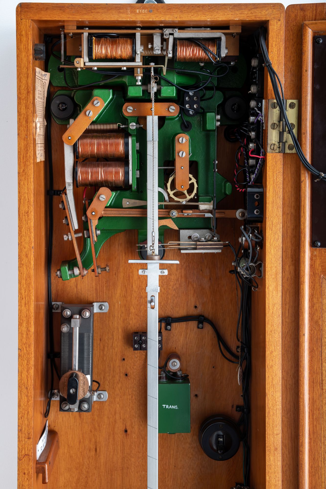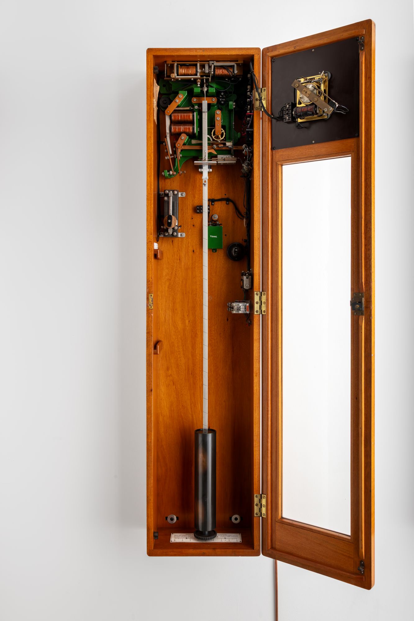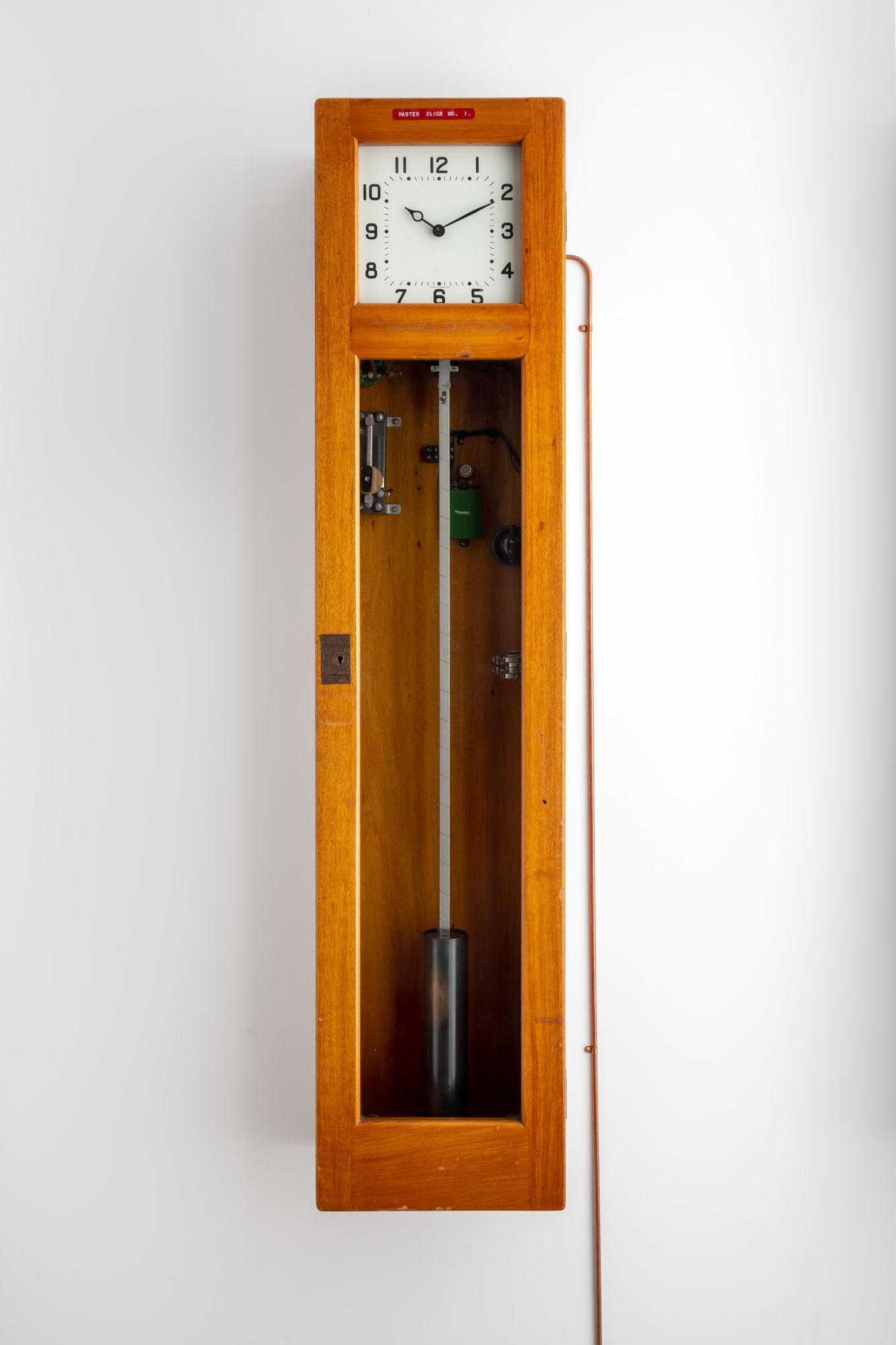 For much of the twentieth century, the Gent ‘C7’ was a fixture in British institutional buildings, thanks to its reliable electrically reset gravity escapement. This example was installed in the new BBC television centre in 1959. Like its fellows, it could control dozens of the corporation’s subsidiary dials. More unusually, it has been fitted with a ‘See-Saw’ synchroniser, which regulates the pendulum according to an internal BBC time signal – six identical tones broadcast internally every 15 minutes (like the hourly ‘Six Pips’, but without the lengthened last pip).