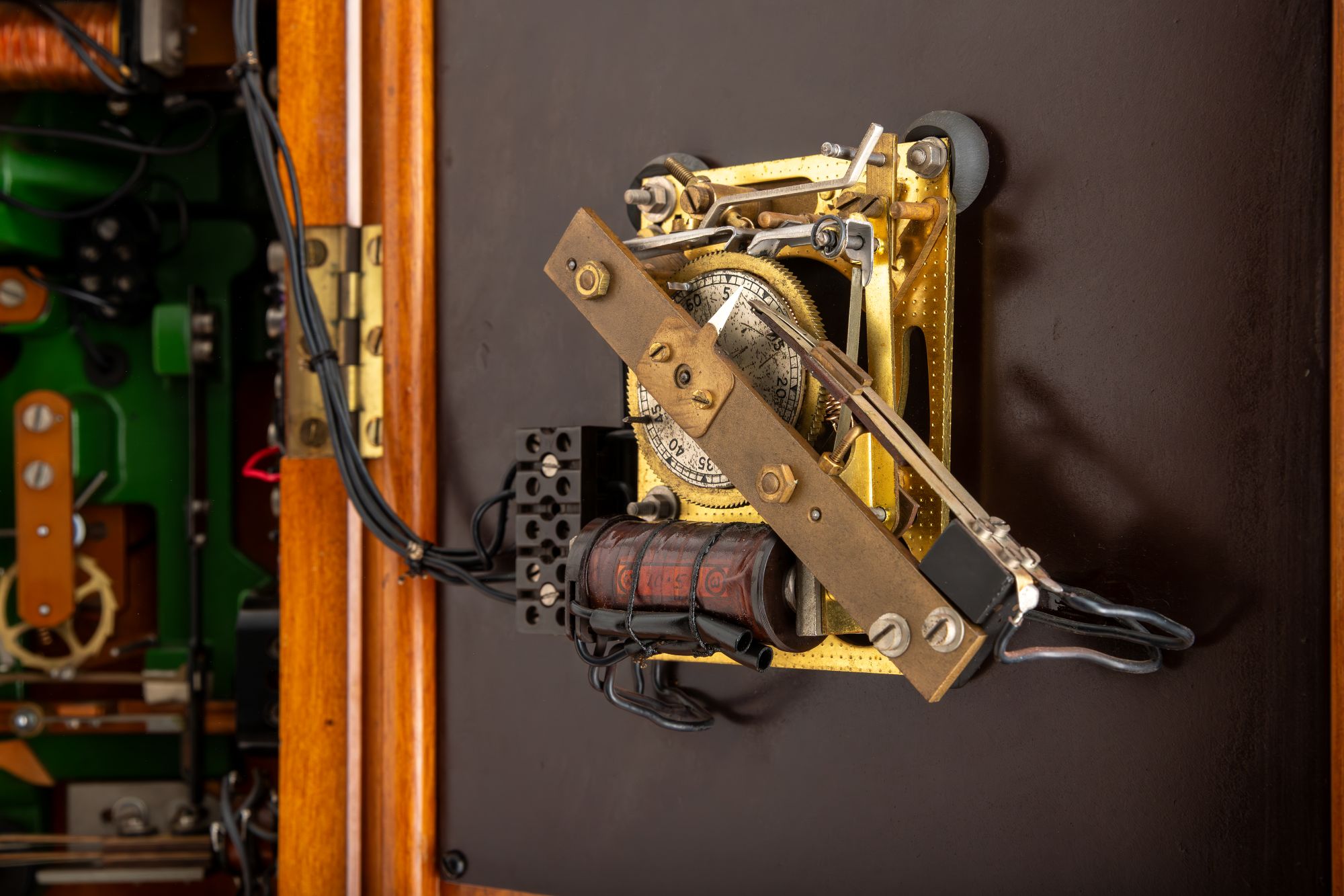 This is a model ‘C7’ controlling clock manufactured by Gent. First produced c.1908, the ‘C7’ became one of the Leicester-based company’s most enduring products. Its success resulted from the innovation of the electrically reset gravity escapement, originally patented in 1904 by Gent’s director Isaac Hardy Parsons (an electrical engineer) in partnership with clockmaker Alfred Ball. The pendulum is impulsed every thirty seconds by a gravity arm, carrying a roller that runs down an inclined plane on the pendulum. The gravity arm is released by the action of a count wheel, advanced by a pawl on the pendulum. At the end of its travel, the gravity arm closes electrical contacts which allow power to flow through the electromagnets which in turn reset the gravity arm in a latched position, ready for the next half-minute cycle. Marketed as ‘Gent’s Pulsynetic [sometimes ‘Pul-Syn-Etic’] System’, and along with the clocks produced by Gent's great rival, Synchronome, this was the first electrical gravity escapement to gain significant commercial traction, being both reliable and economical with current consumption. It was widely used until the 1960s in industrial and commercial settings, transmitting the time around a network of subsidiary dials, from boardrooms and offices to factory floors.