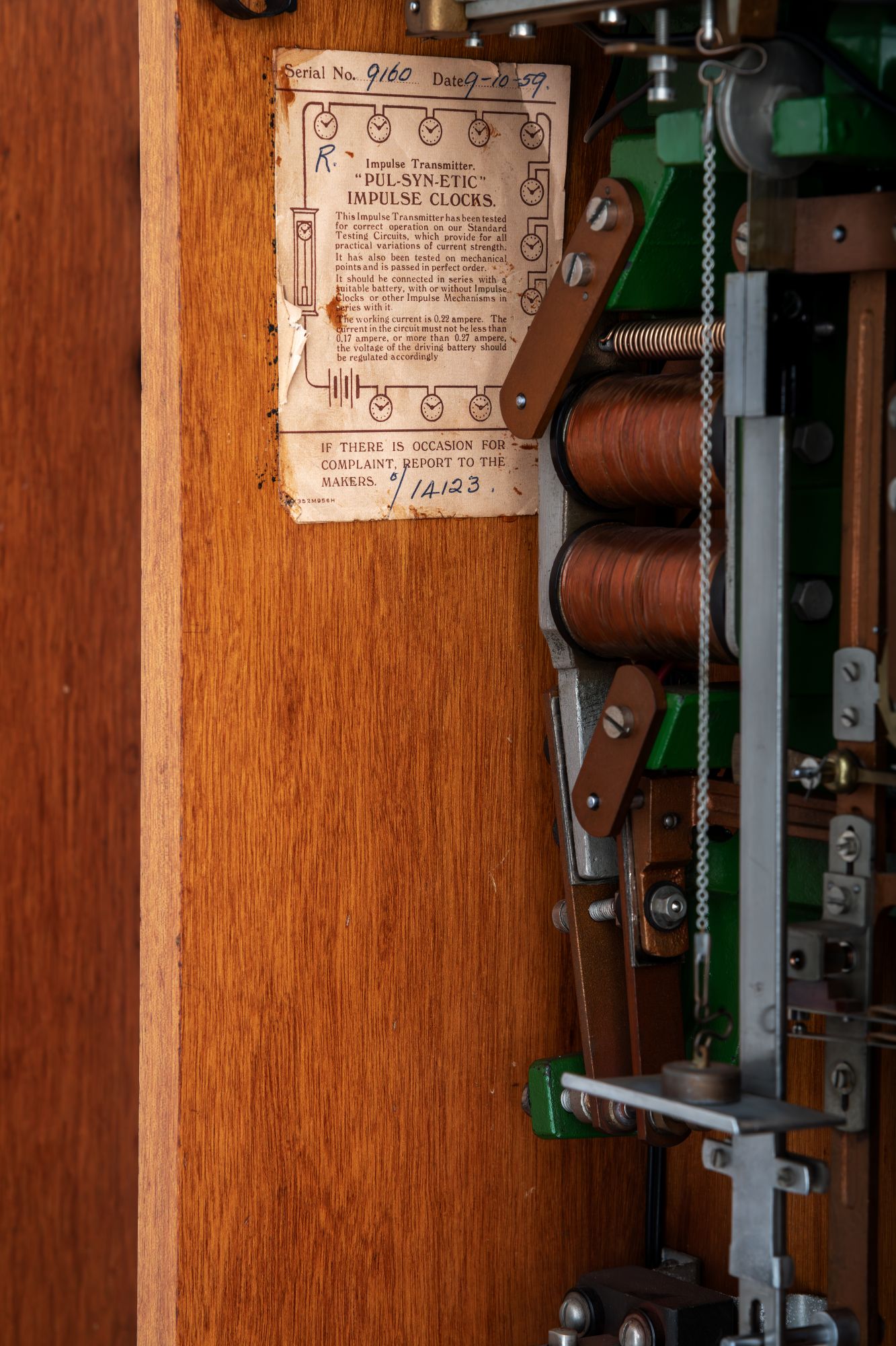 Though the ‘C7’ is already a reliable timekeeper, the accuracy of this clock has been enhanced through the addition of Gent’s so-called ‘See-Saw’ synchroniser, which uses rudimentary gate logic to raise or lower a weight on the pendulum to adjust its speed, in response to a time signal from an external source. This clock was originally installed in the new BBC Television Centre in Shepherd’s Bush in 1959; it was therefore synchronised to a BBC time signal consisting of six identical tones, transmitted each 15 minutes around studios and other key locations in the Corporation (very similar to the famous hourly ‘Six Pips’, but without the lengthened final 'pip'). It was presumably a member of BBC staff who stuck the Dymo tape label on this clock identifying it as ‘Master Clock No. 1’. The label implies the existence of at least one further controlling clock in the BBC offices (presumably immediately adjacent), and indeed, the Corporation’s clock network was extensive, synchronised accurate time being essential to successful scheduling.