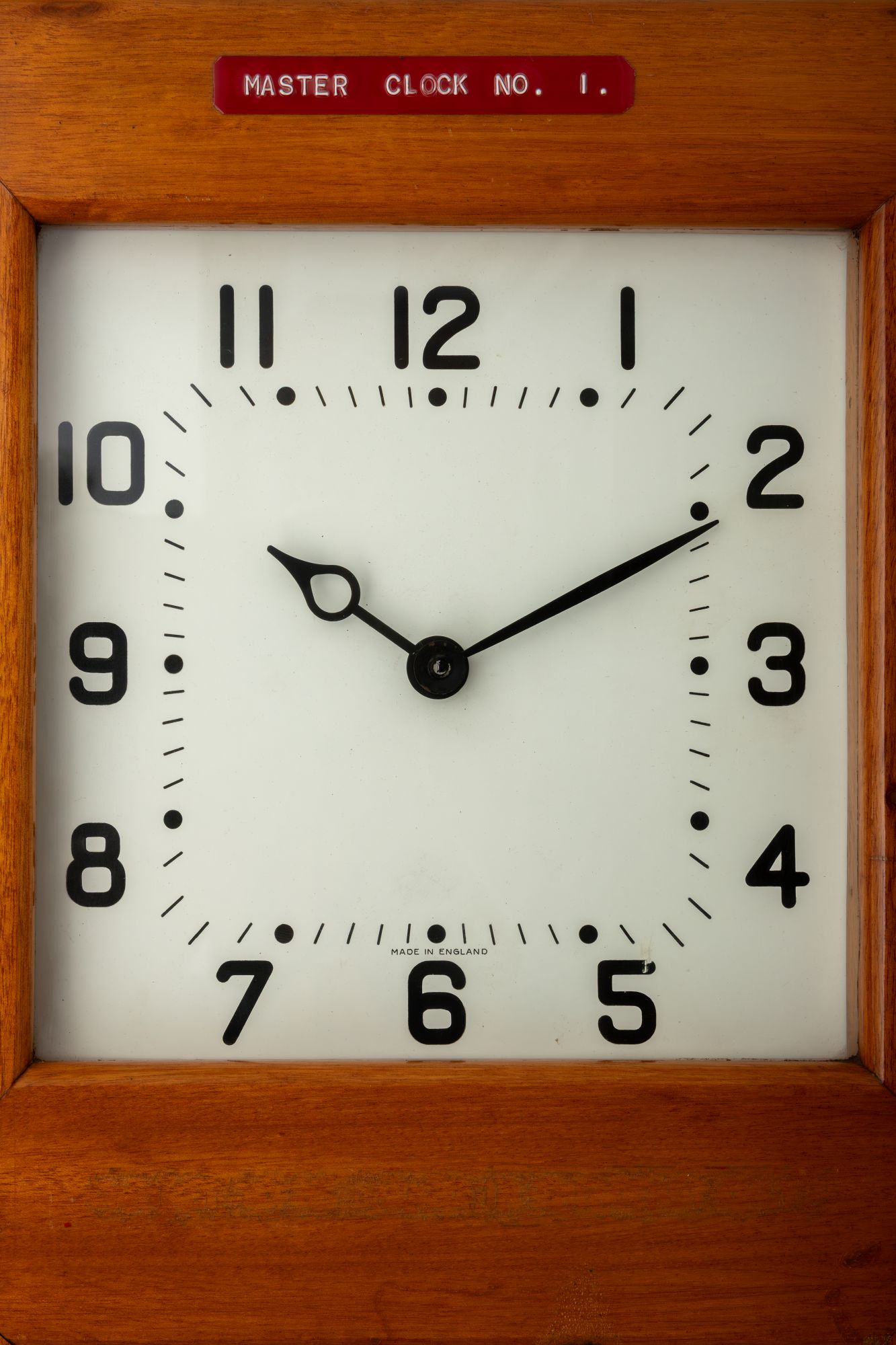 Though the clock reflects the latest in mid-century electrical horology, its commercial use is clear from its agba case, which is typical of the type produced by Gent from the 1930s onwards – designed to be at once robust and self-effacing. Many Gent cases were designed by Hardy Parsons himself, who (in 1905) expressed exasperation at the public enthusiasm for ornate clocks: ‘[O]ne does not,’ he complained, ‘put a gas or electric meter in an elaborate case and give it a prominent position, therefore, my contention is, why should we the “Time Meter”[?]’. Though Gent did, in fact, often make concessions to popular design preferences – including in this case, whose square dial, rounded corners and warm varnish reflect contemporary tastes in furniture – Hardy Parsons’s attitude reflected a new consensus about the use and function of electrical clocks throughout the early twentieth century: these were above all precision instruments for commercial and industrial use, intended to do a particular job, and do it well. However, with the subsequent advance of other forms of timekeeping, notably cheap battery-operated wall clocks, this clock was apparently considered to have outlived its usefulness by the 1990s, at which point it was retired by the BBC and shortly afterwards purchased for The Clockworks.