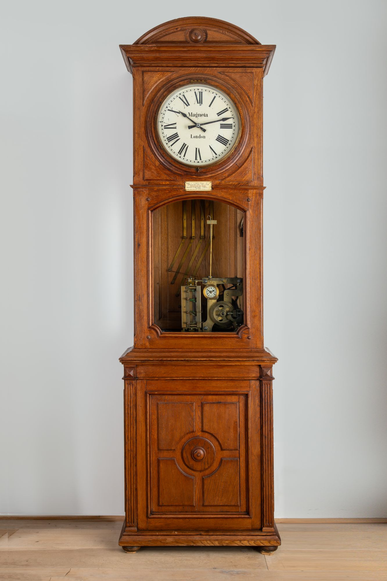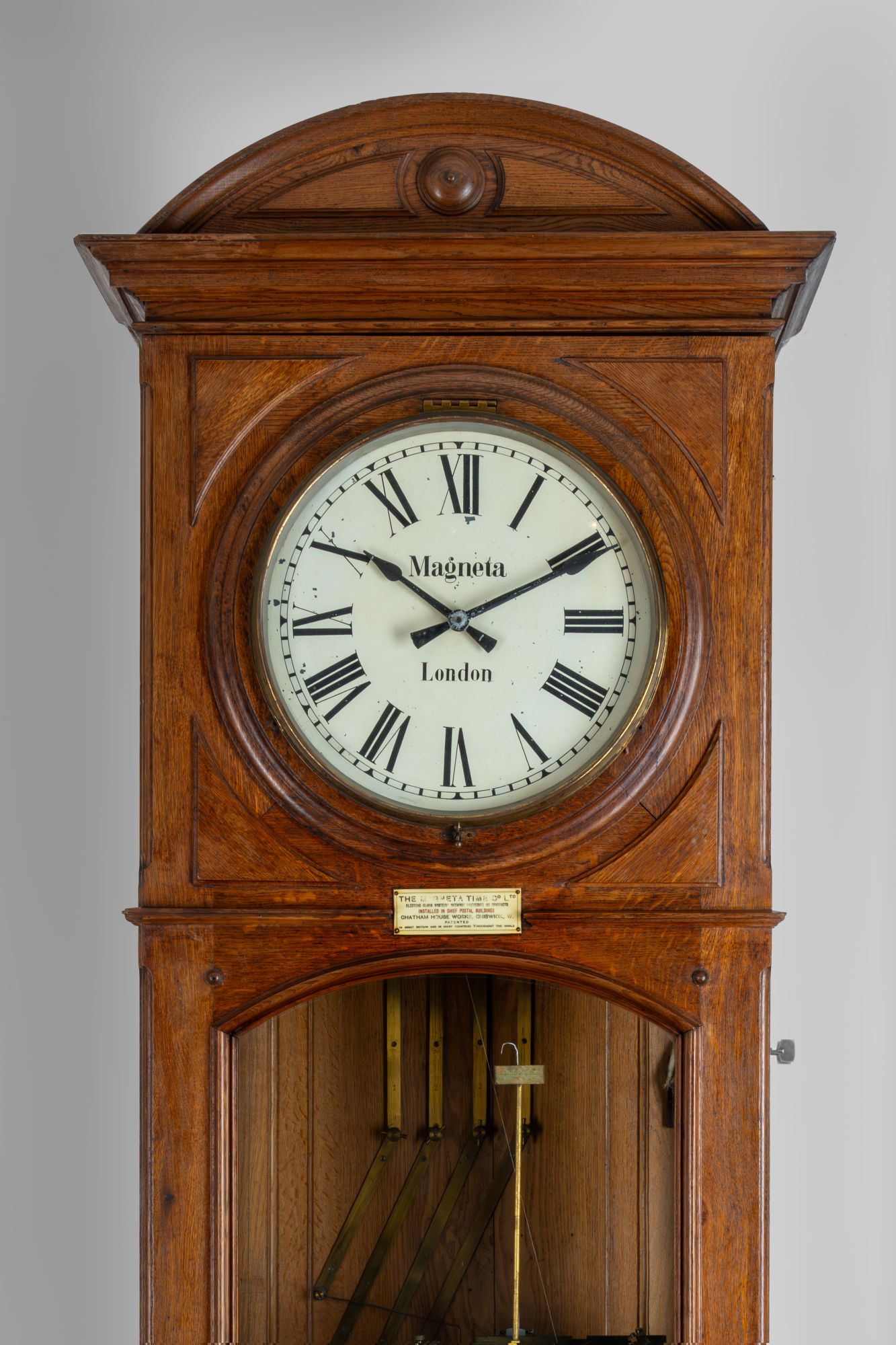 On dial: 'Magneta | London'. Plaque on front of case: 'THE MAGNETA TIME CO. LTD. | ELECTRIC CLOCK SYSTEM WITHOUT BATTERIES OR CONTACTS | INSTALLED IN CHIEF POSTAL BUILDINGS | CHATHAM HOUSE WORKS, CHISWICK, W. | PATENTED | IN GREAT BRITAIN AND CHIEF COUNTRIES THROUGHOUT THE WORLD' On inside door: 13. On plate, in two places: 11 Handwritten beat scale label, running 1—9.