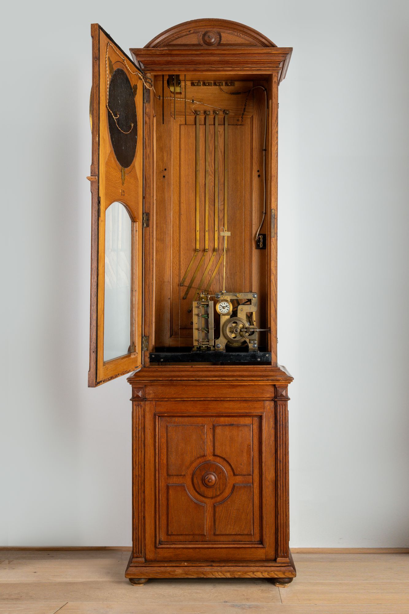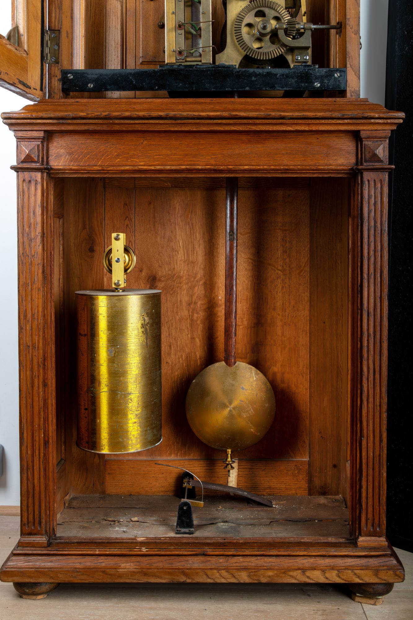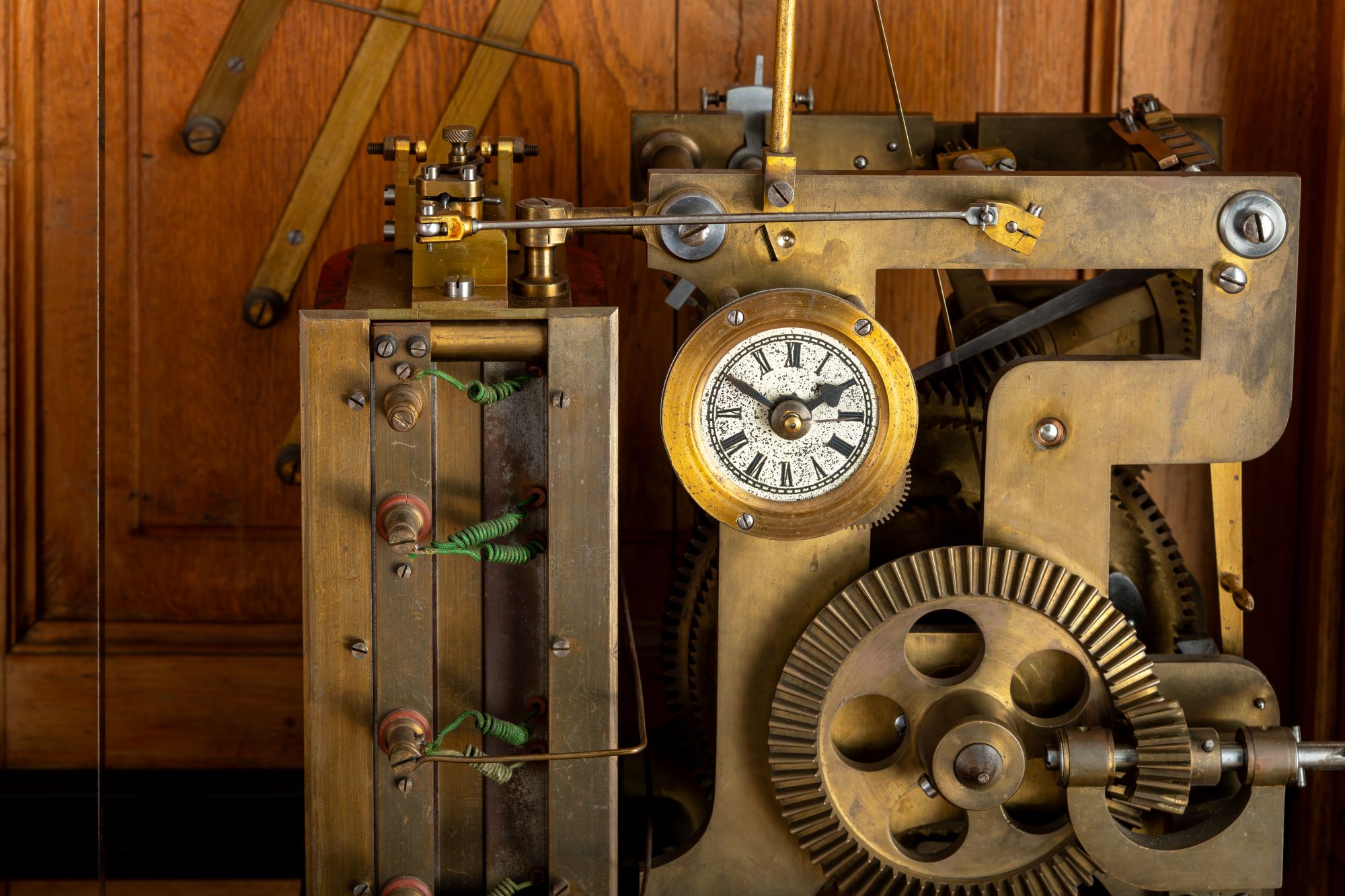 This clock is a Magneta ‘F2’ regulator, in an oak case, capable of controlling up to 100 dials (the D type controlled up to 60; the C up to 35). In common with Magneta’s standard specification, it has an Invar steel pendulum with elliptical bob, Graham dead-beat escapement and Harrison’s maintaining power. It is the slow, incremental falling of the weight – so large it has to be supported by flat steel bands, rather than the traditional gut-line – that generates the power required to turn the armature of a large dynamo once a minute, in a rapid action of relatively limited travel, when it is released by the going train. The rapid action is also used to rewind the remontoir spring in the going train (thus maintaining the pendulum’s arc) and the electrical pulse generated by the dynamo advances the hands on all the subsidiary dials. These subsidiaries are advanced by means of a rocking armature of reversing polarity, which ensures there is no sudden increase in electrical current (see TCW 1029). A simple, but effective, automatic break system is in place at the bottom of the case, to prevent damage to the escapement by the continued when the weight reaches the bottom of the case at the end of the wind.