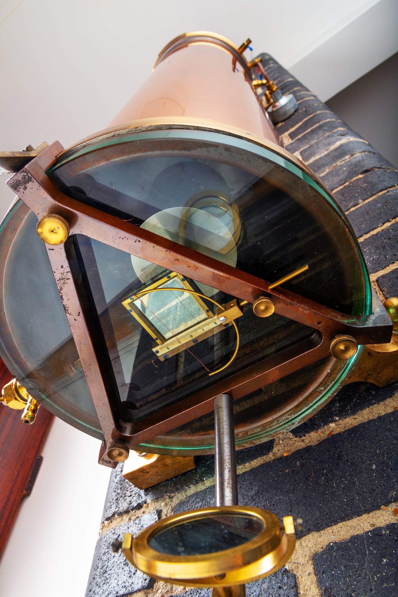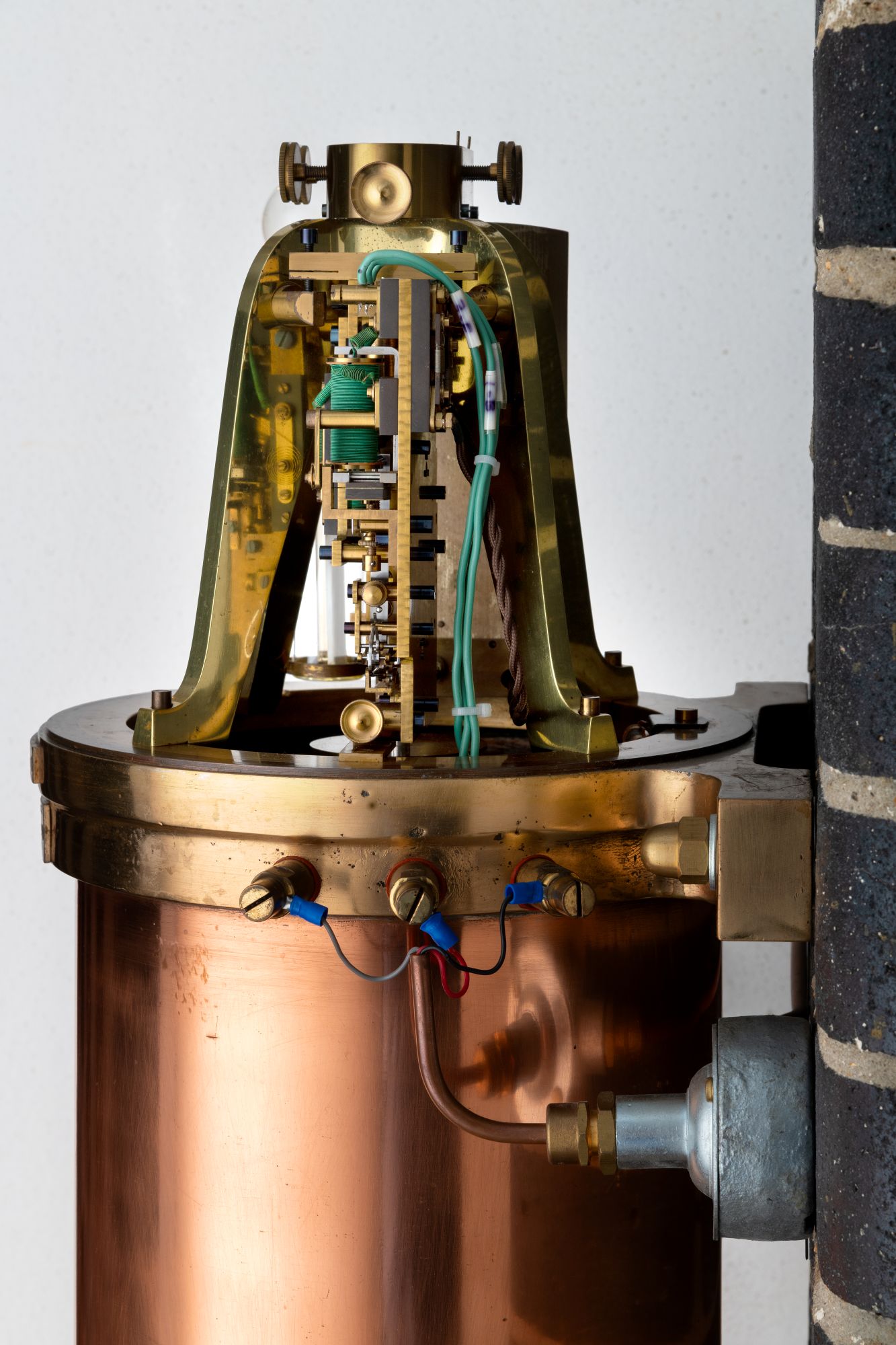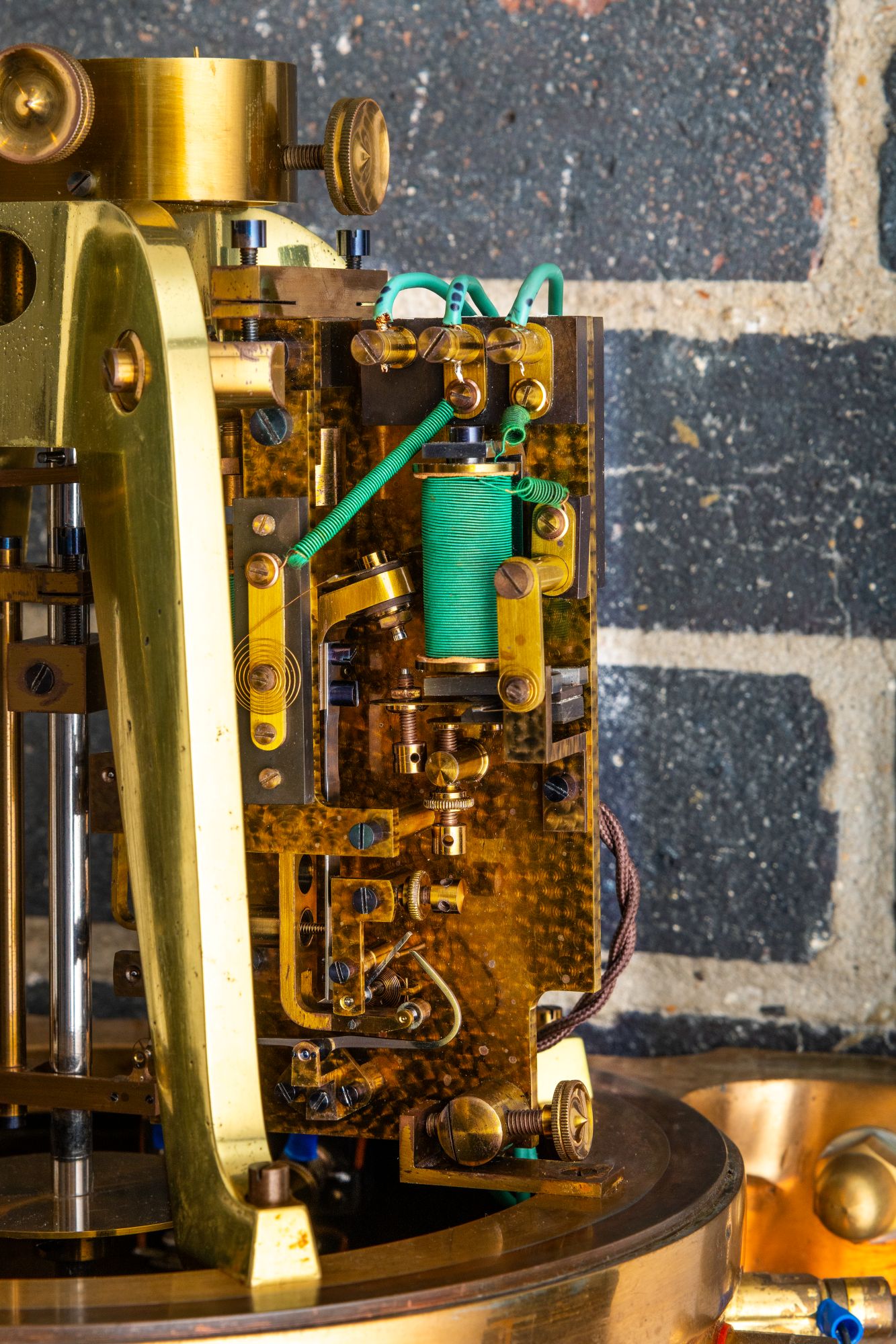 The free pendulum is made of invar, with additional compensation: a piece of brass is inserted into the type-metal bob, using a modified gridiron principle. The length of each pendulum manufactured was calibrated for the gravity conditions of the observatory for which the clock was intended, though its rate could be altered by adjusting the pressure in the tank; in contrast, the rate of the ‘slave’ clock could be adjusted by adding or subtracting very fine weights to the weight tray on the pendulum rod.