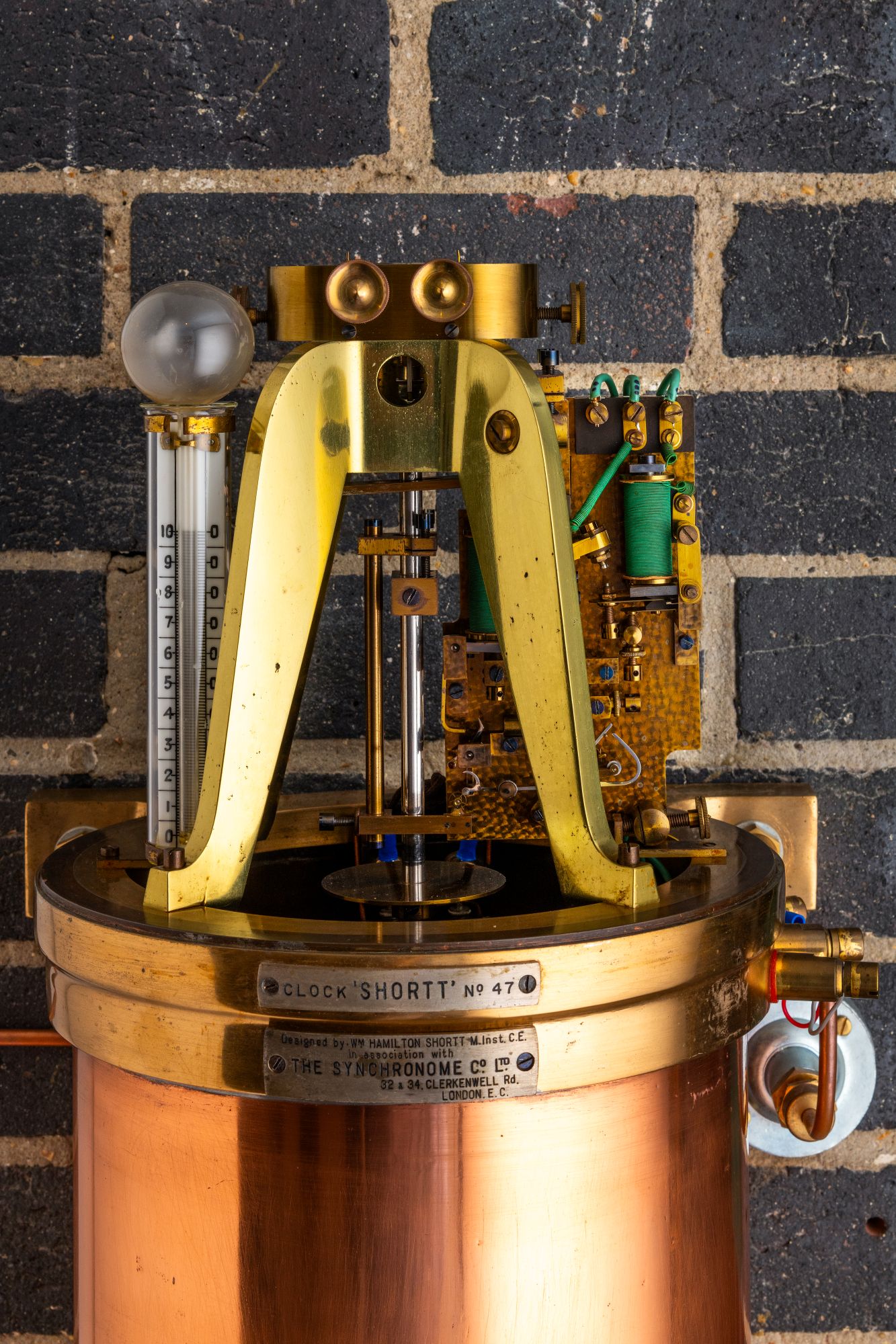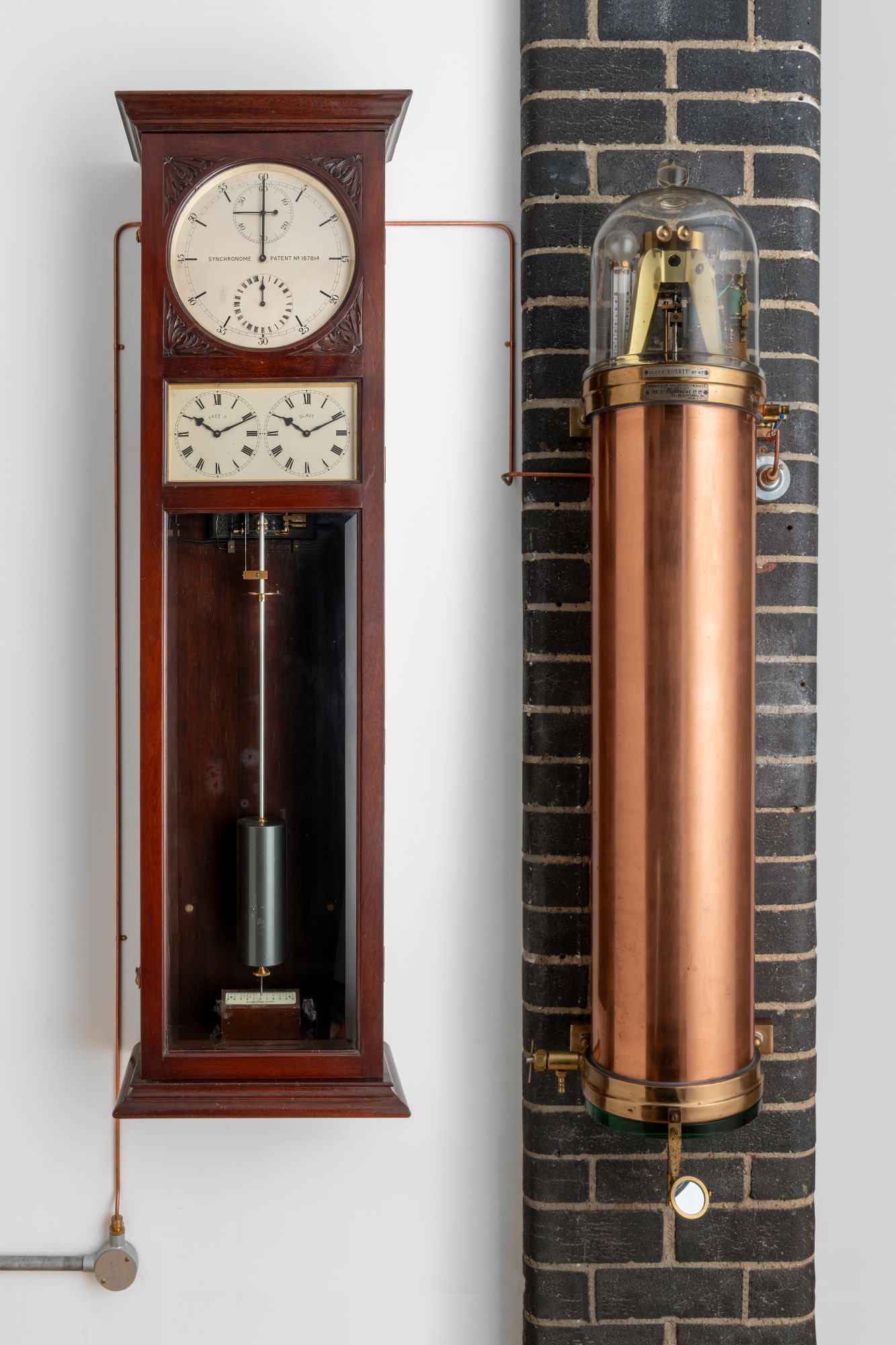 on tank: plaque, ‘CLOCK “SHORTT” NO. 47’ | ‘Designed by WM. HAMILTON SHORTT M. Inst. C.E. | in association with | THE SYNCHRONOME CO. LTD. | 32 & 34, CLERKENWELL Rd. | LONDON. E. C.’ on subsidiary clock: on dial ‘SYNCHRONOME PATENT NO. 187814’ | two dials labelled ‘FREE P’ and ‘SLAVE’. On plate inside case: ‘ENGLISH MADE | Patented’. Serial number on plate: 4210
