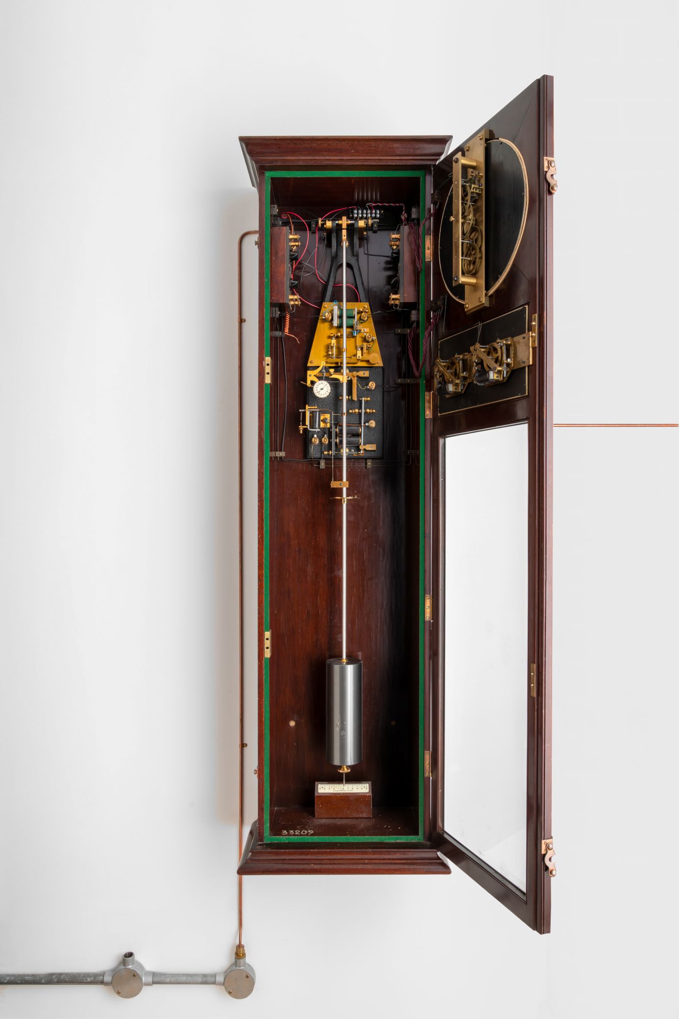 The goal of the ‘free pendulum’ was effectively achieved in 1921, with this clock, designed by Wimbledon-born railway engineer William Hamilton Shortt. At a rate of a second a year, Shortt’s clock was (at the time) the most accurate pendulum clock ever commercially produced – capable of measuring small fluctuations in the earth’s rotation, as well as plotting star transits – and it remained a widely used time standard until the 1950s. Shortt’s innovation was to divide the requisite tasks of a clock between two pendulums that were separate but connected. One, dubbed the ‘master’, was the fabled free pendulum, swinging solitary and undisturbed in a cylindrical copper case sealed by a glass bell jar at the top, and a disk of plate glass at the bottom. This was the timekeeper, and the mechanism contains no countwheel – instead the pendulum is impulsed each thirty seconds using an electrically reset gravity arm. Crucially, the master clock does not initiate this impulsing process. It is the other clock, named the ‘slave’, which sets each thirty-second cycle in train, and it was the subtle and complex synchronisation between the two – facilitated by Shortt’s so-called ‘hit and miss synchroniser’ – that ultimately presented the time.