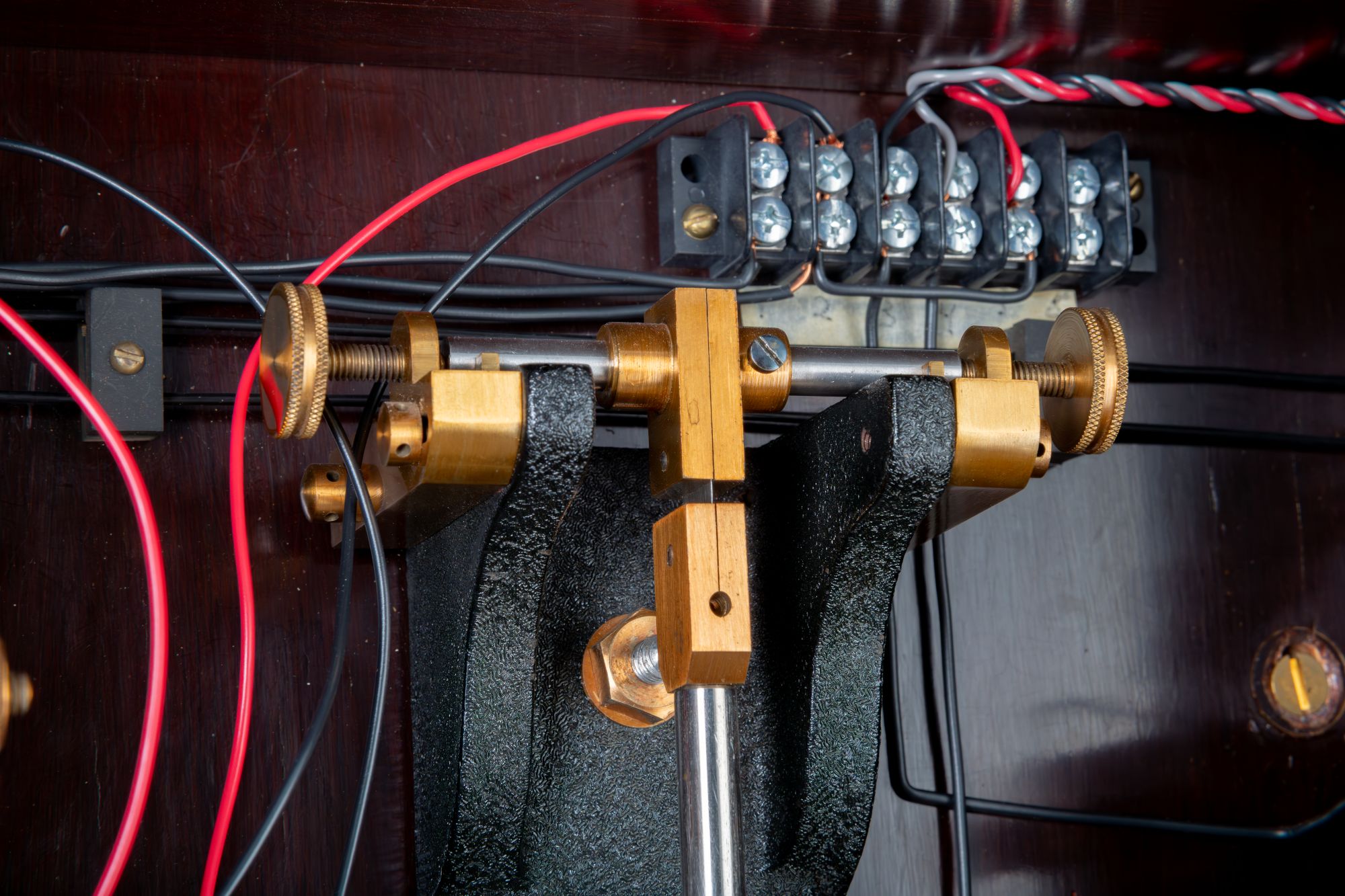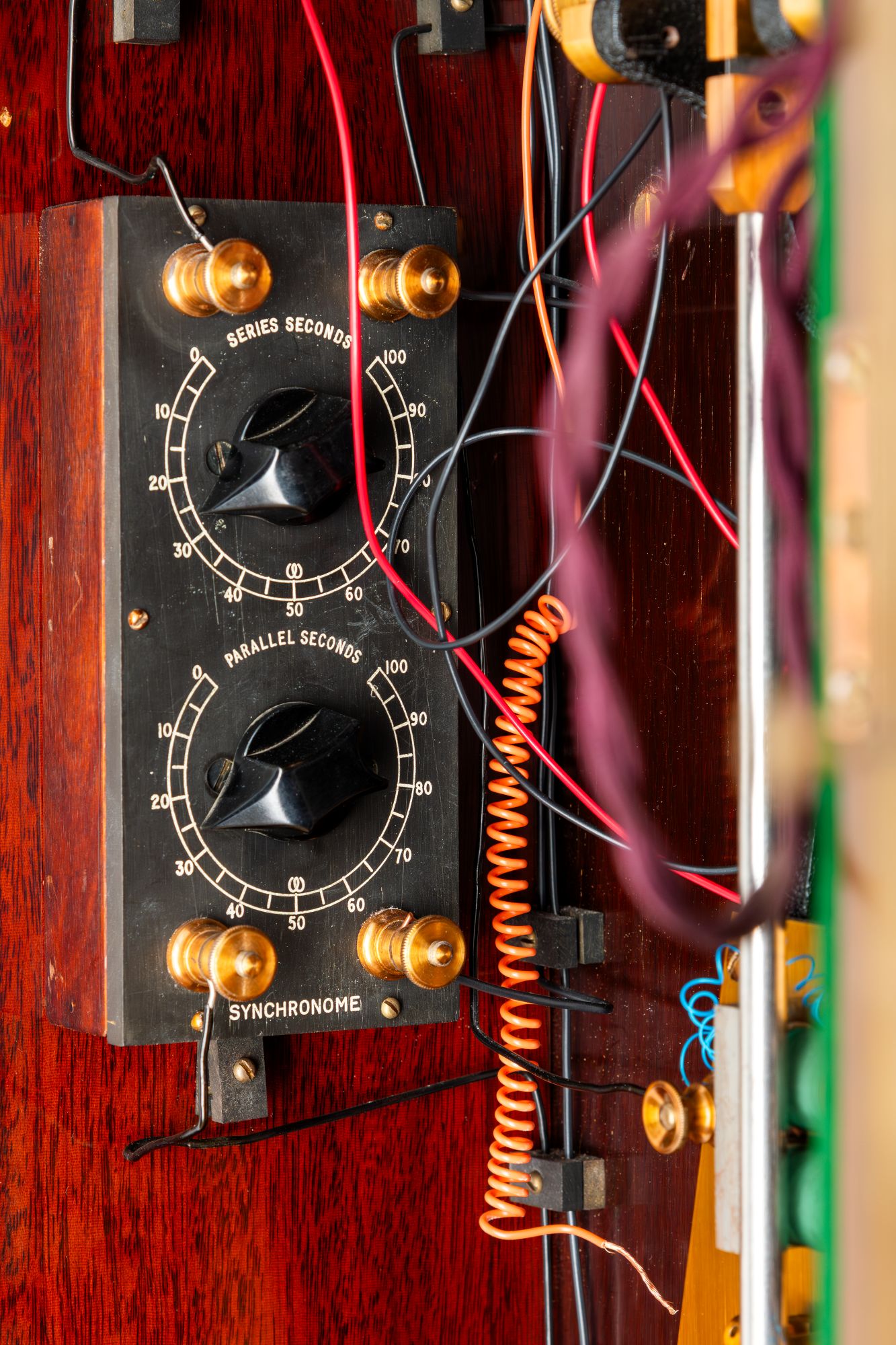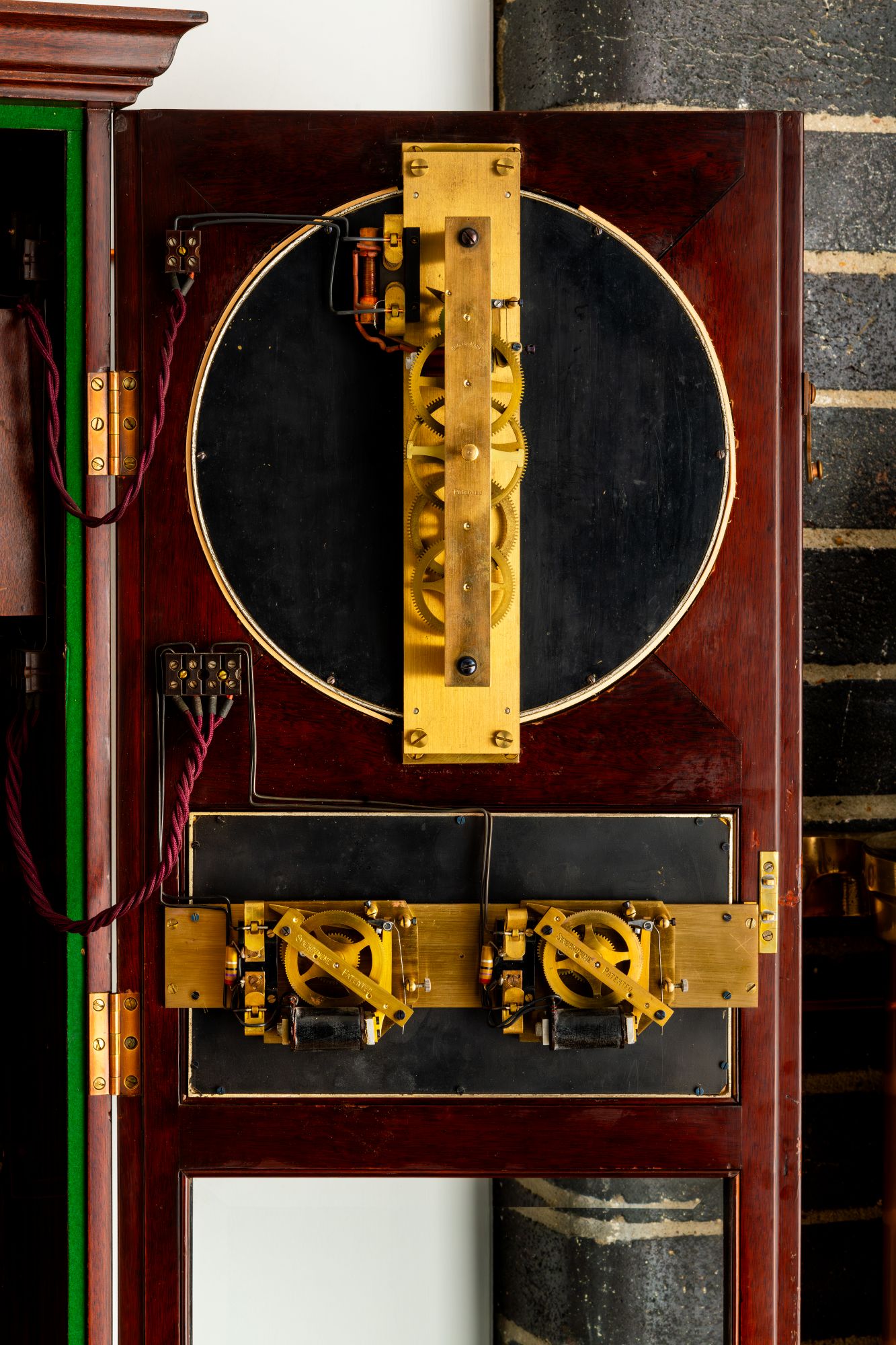 The two clocks are electrically linked; the free pendulum transmits a synchronising signal to the ‘slave’ every 30 seconds. The fall of the master gravity terminates with the closing of an electric circuit which includes the electromagnet in the ‘slave’ pendulum synchroniser – a long spring which will accelerate the 'slave' pendulum if it comes into contact with it. Since the ‘slave’ is specially rated to lose about six seconds a day (1/480th of a second per half-minute), the action will either accelerate or do nothing - hence the phrase ‘hit and miss synchroniser’.