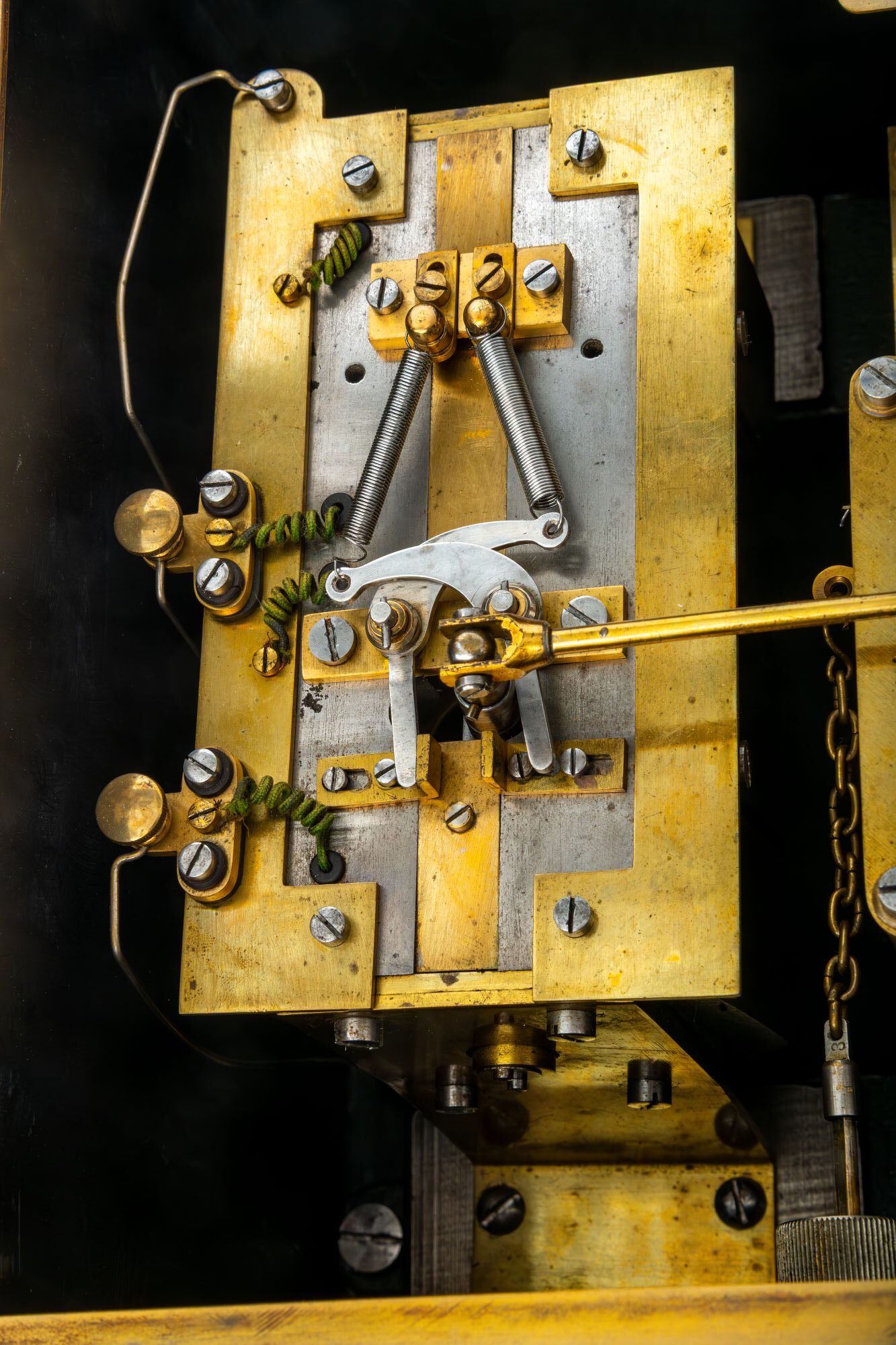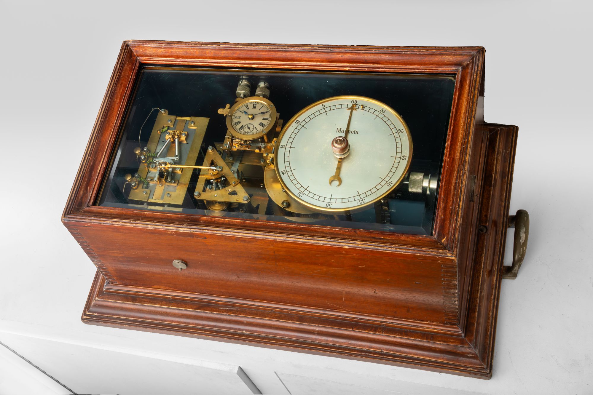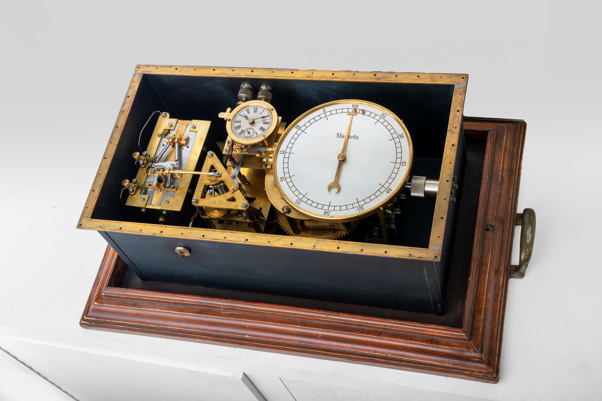 First documented in 1908, this may be the earliest successful timekeeping system for ocean liners. Capable of controlling up to 25 ‘subsidiary’ clocks across a large vessel, Magneta’s marine impulse transmitter uses the Swiss firm’s patented battery-free system. Every minute a mechanical unit releases a powerful spring which drive the rotation of an armature within the magnetic field generated by a group of permanent horseshoe magnets at the left. This creates a powerful alternating polarity electrical pulse, sending a short impulse through the whole circuit and advancing the hands of the clocks connected to it by one minute. The power required to bring this about is supplied by a large 2” mainspring, which is rewound with a large crank approximately every two days.