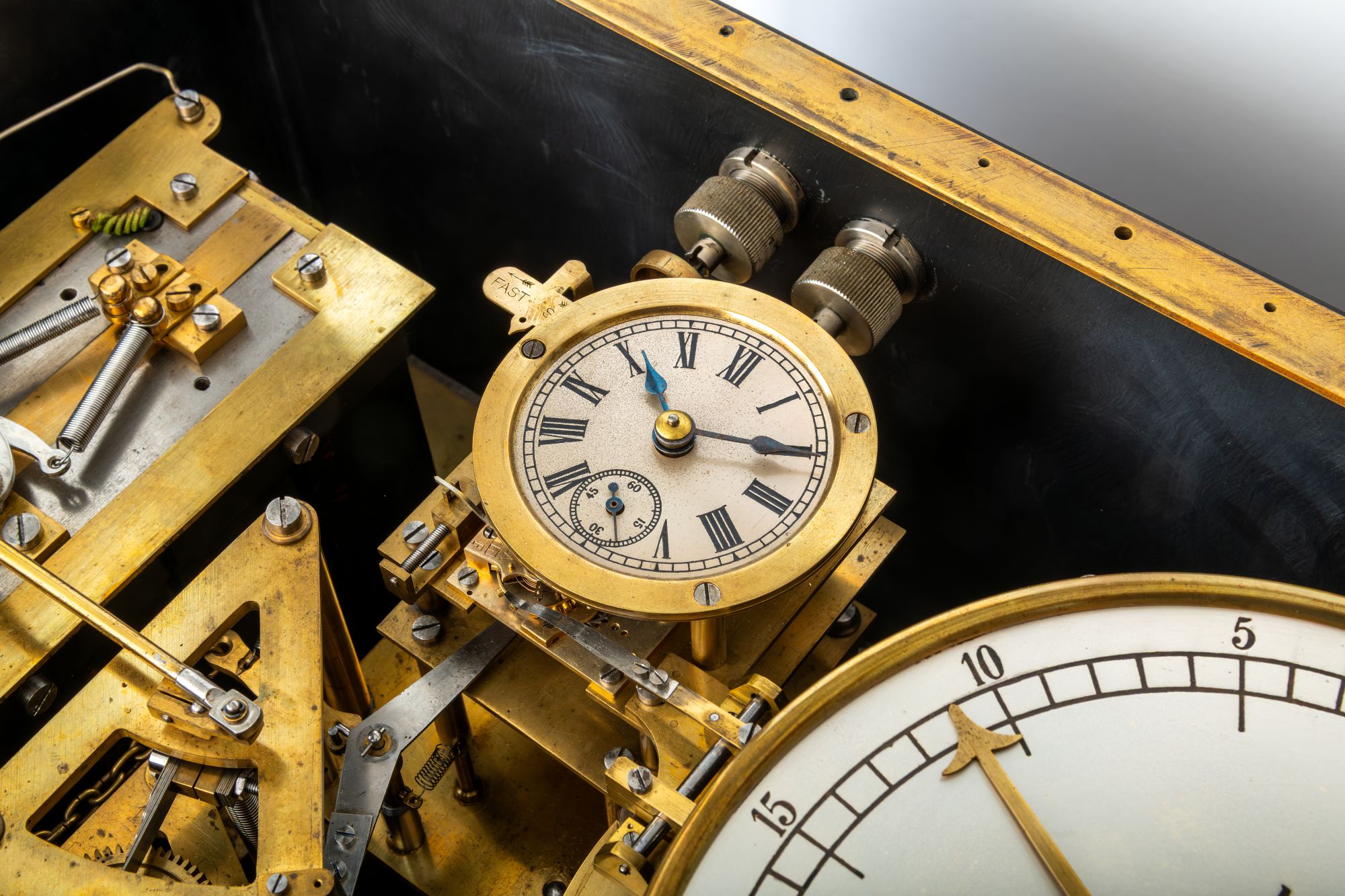 However, this clock also has maritime adaptations – most obviously, the horizontal platform escapement and (supposedly) watertight case, which comprises a zinc chest with sealed bevelled glass top, contained within an oak frame with brass carry handles. As the ship travelled east to west or west to east, it would move through time zones, and this time transmitter allows the operator to adjust the time on subsidiary clocks by their desired amounts. On an eastbound crossing, they could pull a small chain connected to the release mechanism to advance the subsidiary clocks (and the pilot dial) by several minutes at a time. Travelling west, the ‘retard’ unit was set with a key through the glass; the setting hand was rotated to the time desired (up to 55 minutes) and a second escapement – a small watch movement spring – would drop a lever spring directly onto the balance on the main clock, stopping all pulses, and effectively taking subsidiary clocks out of the circuit while it counted down the selected time for ‘setting back’. At the end of the counted period, the balance brake on the main movement platform escapement would be released and it would resume timekeeping duties.