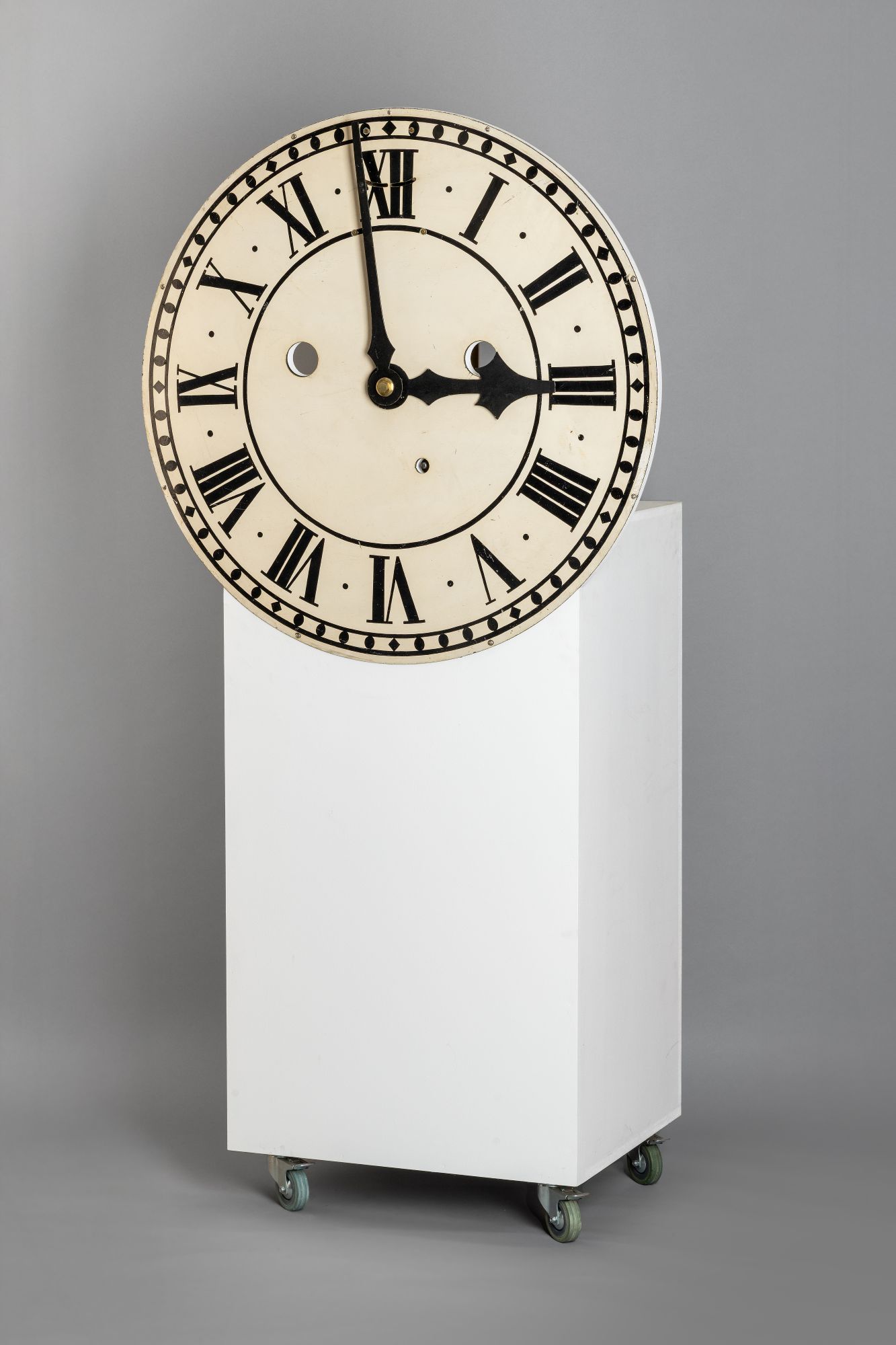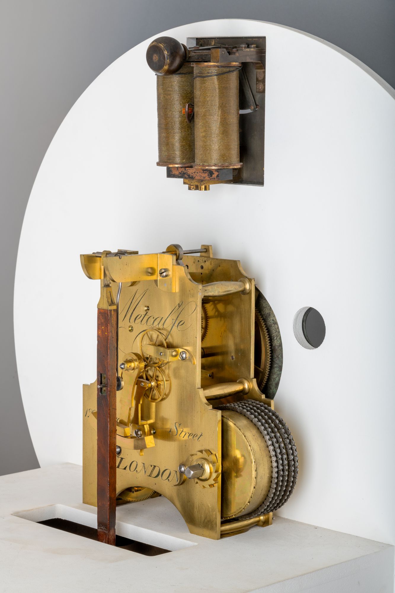 At an impressive 33 inch (84 cm) diameter, this mechanical clock was once placed prominently in the London Stock Exchange – attested by its badged winding crank (which, unusually, it retains). Apart from its size, the movement is a standard version of the type used in an ‘English dial’: it is spring-wound with a winding arbor to the front for its eight-day movement, and has a deadbeat escapement and short (20 inch) pendulum (originally concealed by a wooden case). The plate is badged ‘Metcalfe, 122 Newgate Street, London’, but the movement has a number from Thwaites, who frequently supplied clocks to other retailers. English dial clocks proliferated from the late eighteenth century, in response to demand for cost-effective, practical timekeepers in public buildings such as banks, pubs, coffee houses, offices and – later – railways.