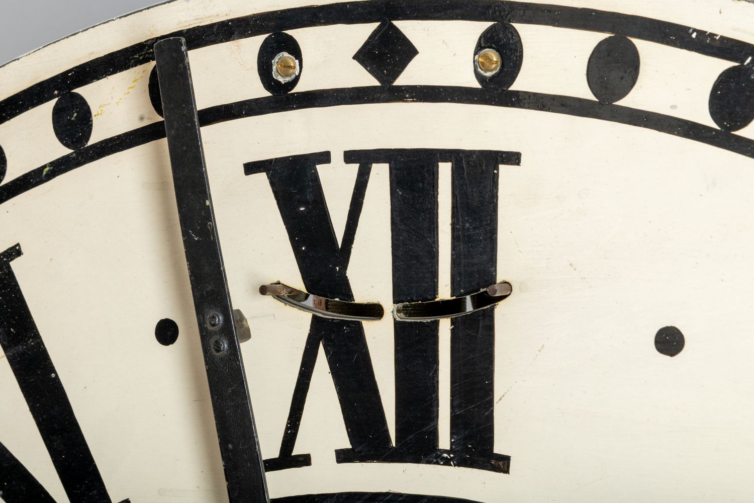 This mechanical clock had a second career as an electro-mechanical timekeeper. At some point, probably between 1876-86, it was retrofitted with an electric synchroniser by the firm of Barraud & Lund – originally chronometer makers, but from 1868 increasingly operating as a time synchronisation service under the leadership of John Alexander Lund. As part of this alteration, a slot was cut through the dial at the ‘12’ position, and two solenoids fitted on the reverse. This would have allowed the clock to receive hourly time signals – either directly from Barraud & Lund themselves, over wires rented from the Post Office Telegraph Department, or through a third party ‘local accredited time-keeper’, again over Post Office wires. The electric signal, for which clients paid an annual subscription of £5 5s 0d, would activate the electromagnets, in turn attracting the soft iron armature above, arranged to move cranked levers carrying two pins which emerge through a sector in the dial, either side of the minute hand, allowing forcible correction of the hands – ‘zeroing’ them to the hour.