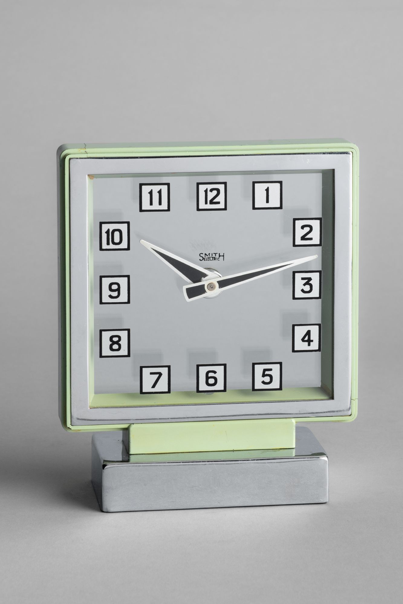 The chromium casings came in a range of muted colours – though green and black, as here, were the most common – and the dial was occasionally also presented in a stepped wooden surround. The painted Arabic numerals and dagger hands are characteristic of the Art Deco style then in vogue.